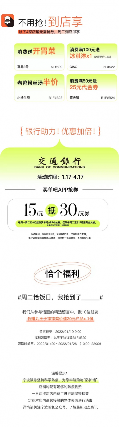 本周起,每周一10:00起至每周日22:00抢券,周二当天可用。买一送一、超低折扣、半价专享、到店即享连环放送,银行优惠加倍乐享。来周二恰饭日,在一场舌尖盛宴上感受到身体和精神的双重滋养。
